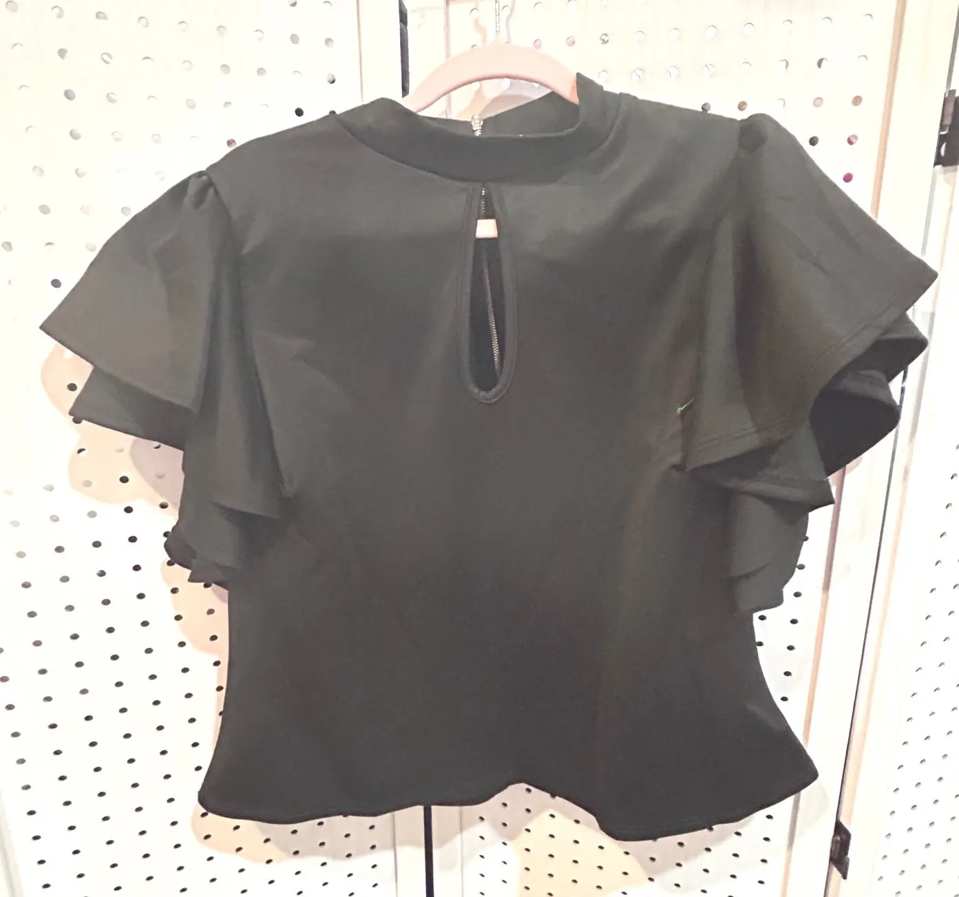 Size 2 in figure to fashion size chart. It's supposed to be a 2X but works for me as a XL. This is a luxury item and like new condition. A black mock neck peplum top with dramatic tiered ruffle sleeves and a stylish keyhole cutout at the neckline. This top features a convenient full zipper closure at the back, offering both a flattering silhouette and ease of wear. Its elegant design makes it perfect for a night out, a formal event, or a chic office ensemble. Type: Blouse Department: Women Material: Polyester Blend Neckline: Mock Neck Sleeve Length: Short Sleeve Sleeve Type: Bell Sleeve Pattern: Solid Accents: Ruffle, Zipper Features: Keyhole Neck