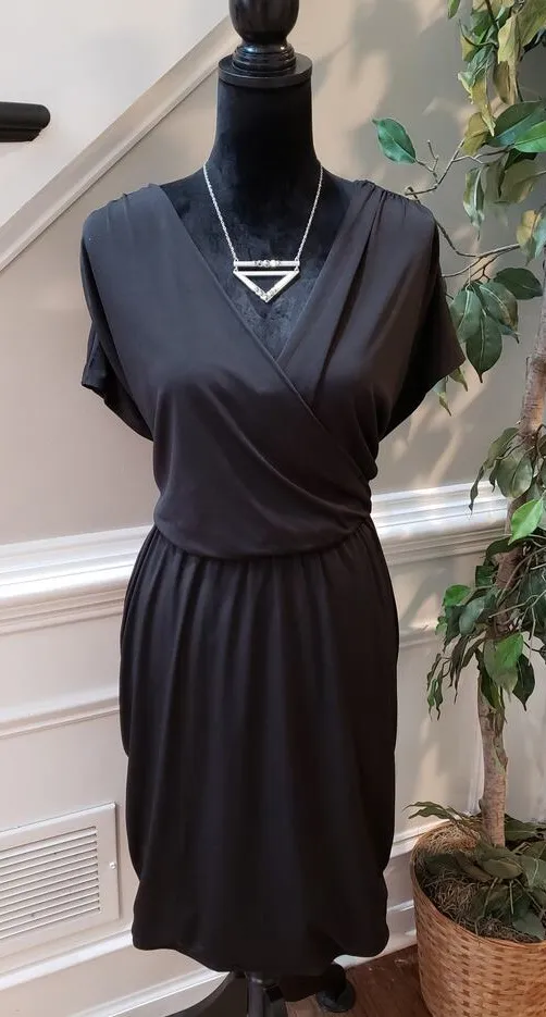 Fashion to Figure black wrap dress in size 4 (2X) features a flattering V-neckline, short sleeves, a... Show more