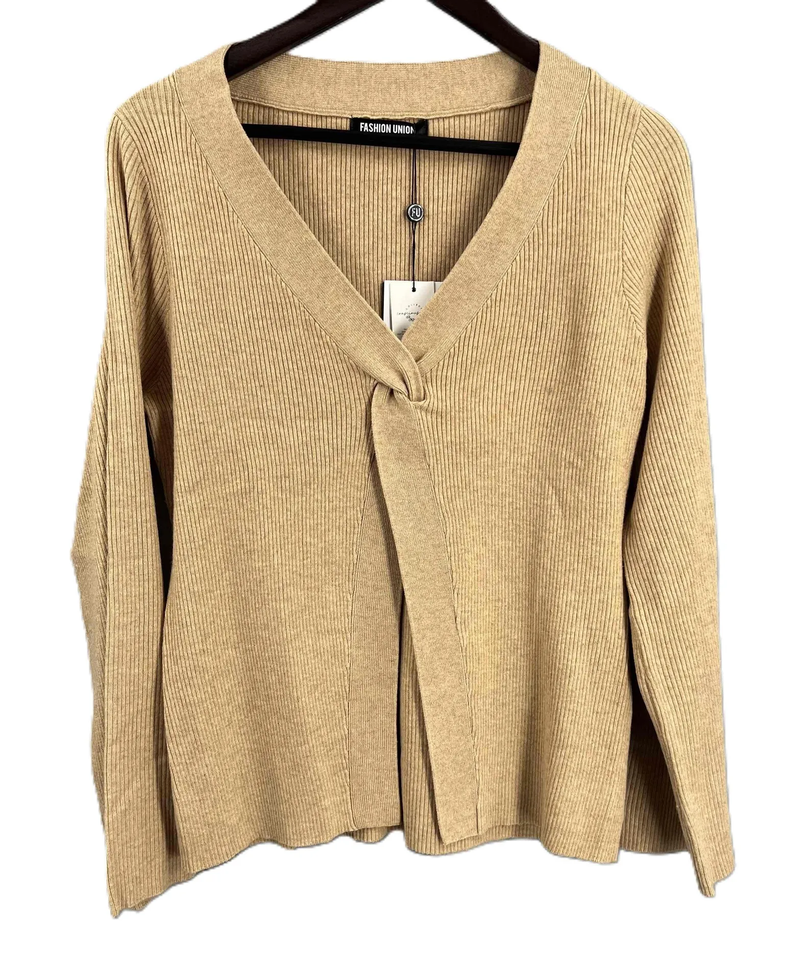 Fashion Union Cardigan Sweater Neutral Tan Ribbed Knit Open Twist Front 10 Perfect for any modern w... Show more
