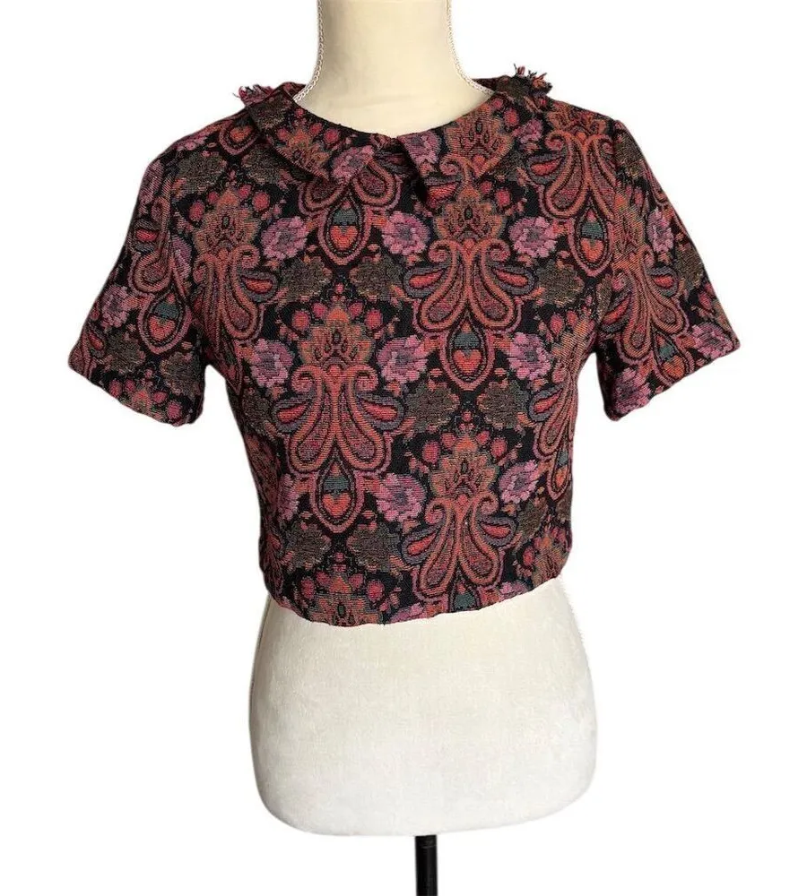 This Fashion Union blouse is a size 6, regular fit, and features a multicolor floral tapestry textured pattern. Made from a blend of polyester, cotton, rayon, and other fibers, it has a collared neckline and short sleeves. The cropped style with a zip closure is ideal for casual spring occasions. The blouse is pre-owned, excellent condition. Brand: Fashion Union Size: 6 Color: Multicolor Type: Blouse Department: Women Style: Cropped Material: Polyester, Cotton, Rayon, Other Fibers Neckline: Collared Sleeve length: Short Sleeve Pattern: Floral Closure: Zip Fit: Regular Occasion: Casual Season: Spring Measurements upon request 0248