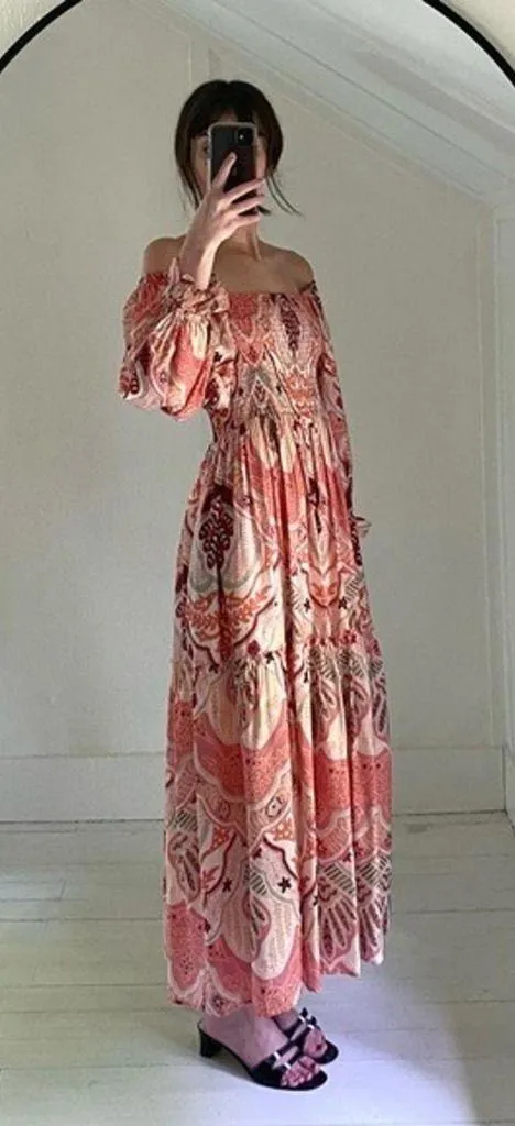 Fate coral/pink, printed, 3/4 sleeve, square neck midi dress. Lightweight woven fabric construction in an allover multi print & tiered design with cinched, pleated detailing. Smocked elasticized bodice & sleeve openings. 3/4 puff sleeves with elasticized frilled ruffle cuffs. Square neckline & back. Relaxed fit, midi-length, a-line silhouette. Side pockets. Pullover styling. Lined. Excellent condition - fraying at hem seam. Self: 70% viscose, 30% nylon Lining: 100% cotton Bust: 28” Length: 48.5” --- E4966