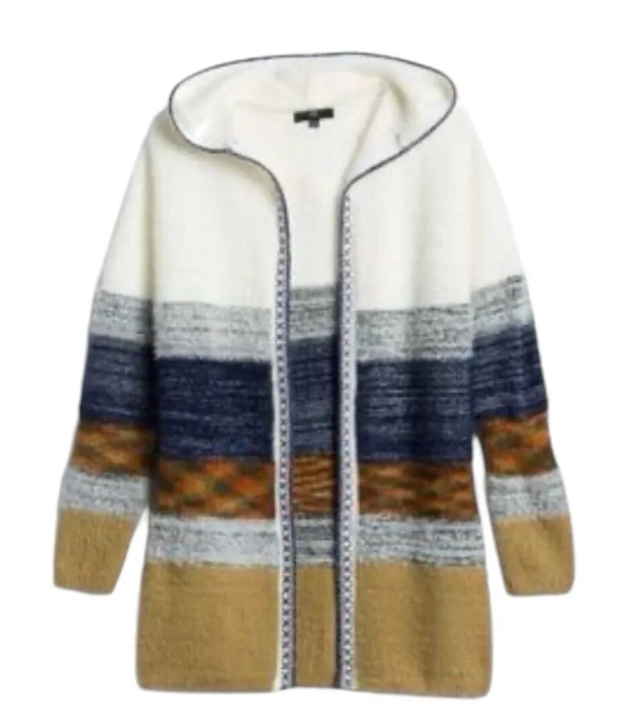 Add a touch of the Wild West to your wardrobe with this Fate Sweater in Siena. The colorful striped pattern and Aztec accents give it a unique and eye-catching look. This hooded cardigan is perfect for travel or casual occasions, and its tight-knit fabric will keep you warm in the chilly fall, winter, and spring seasons. The classic sleeve design and open neckline add a touch of elegance, while the stitch character detail adds a fun and playful touch. This sweater is made of a blend of nylon and acrylic materials and should be dry cleaned only. Available in size XS, this Fate Sweater is a must-have for any fashion-forward woman who wants to add a touch of Western style to her wardrobe