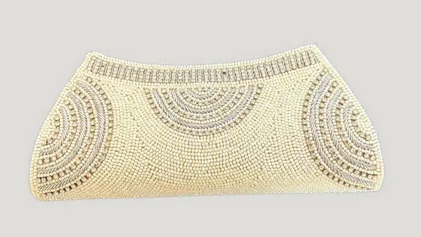Geometric arranged Faux pearls with Crystals give this sparkly evening Clutch a mesmerizing pattern. Use the tuckable chain while you're on the dance floor and tuck it in for a streamlined look. Snap closure Detachable chain Imported Approx. 3"h, 7.5"W, 1.5"D NOTE: This item is IMPORTED and not purchased in US ********* This is NWT item but one of the Rhinestone has come off - No other issues ***********