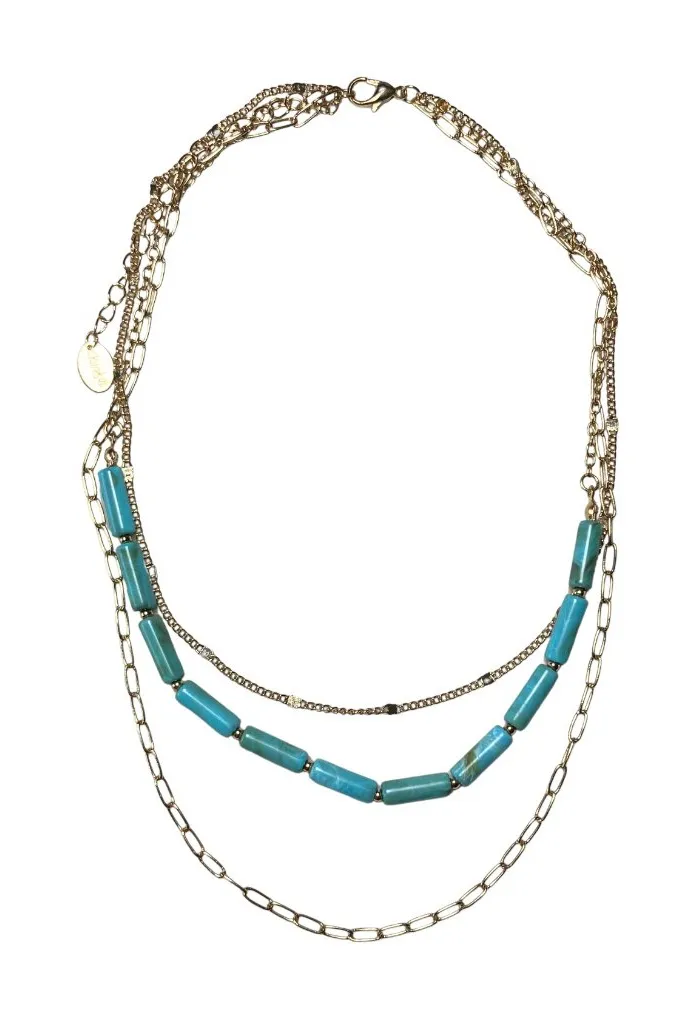Multistrand layered gold tone chain link and faux turquoise beaded necklace from Claire’s. Adjustable 14.5” length with an additional 3” extender - up to 17.5” length. Gold tone multistrand necklace with layers of different size chain link and a faux turquoise beaded section in the center. Faux turquoise beads are soft (not stone) with a watercolor-esque marbled look. Beautiful boho, southwestern style layered necklace for casual wear or a festival look. New without tags & in perfect condition. Only used to stage outfits on a mannequin and never worn. 14.5-17.5” length (shortest chain) Additional few inches on the longest chain. 0.35 oz boho, bohemian, southwestern, western, faux turquoise, layered, multistrand, gold tone, chain link, festival, adjustable, beaded, casual, Claire’s, layering