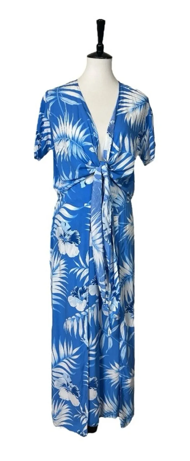 Style Details • 2 piece beach set • Tie/wrap front top - Cropped, short sleeves - Wrap around or tie front • Wrap around pants - Elastic waist - Flat front, high waist - Slightly cropped - Relaxed fit, wide leg • Blue & white tropical print • 100% rayon, machine wash • Excellent preowned condition Fit Details • Size Large • Top - 19” across underarms - 15” length from shoulder to hem • Pants - 14” across waist - 23” inseam • Measurements taken across laying flat Spring summer beach vacation casual tropical coverup poolside flowy island cruise resort