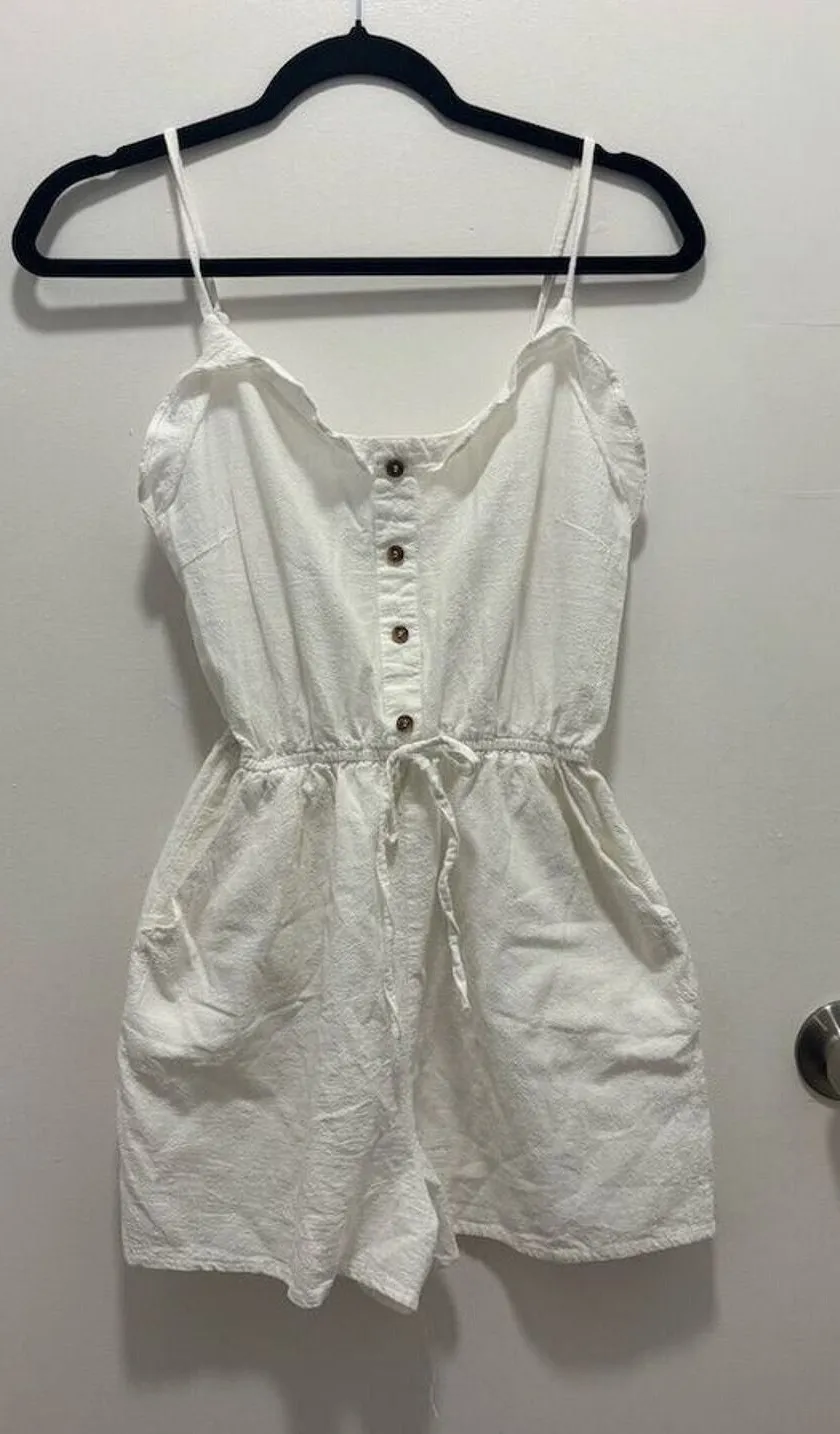 FAVLUX Fashion women's white button front romper with a drawstring waist. This one-piece garment features thin spaghetti straps and a ruffled neckline detail. The front closure consists of functional buttons, and a tie belt cinches the waist for a customizable fit. Two side pockets are incorporated for convenience. Keywords: white romper, button up, spaghetti strap, cinched waist, summer, casual, beachwear, short romper, utility pockets, ruffled trim, easy wear, day dress