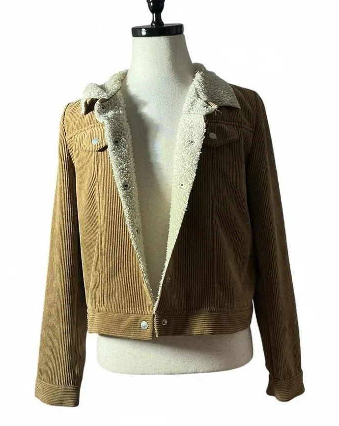 A stylish tan corduroy trucker jacket with cozy sherpa lining. This jacket features a classic button... Show more