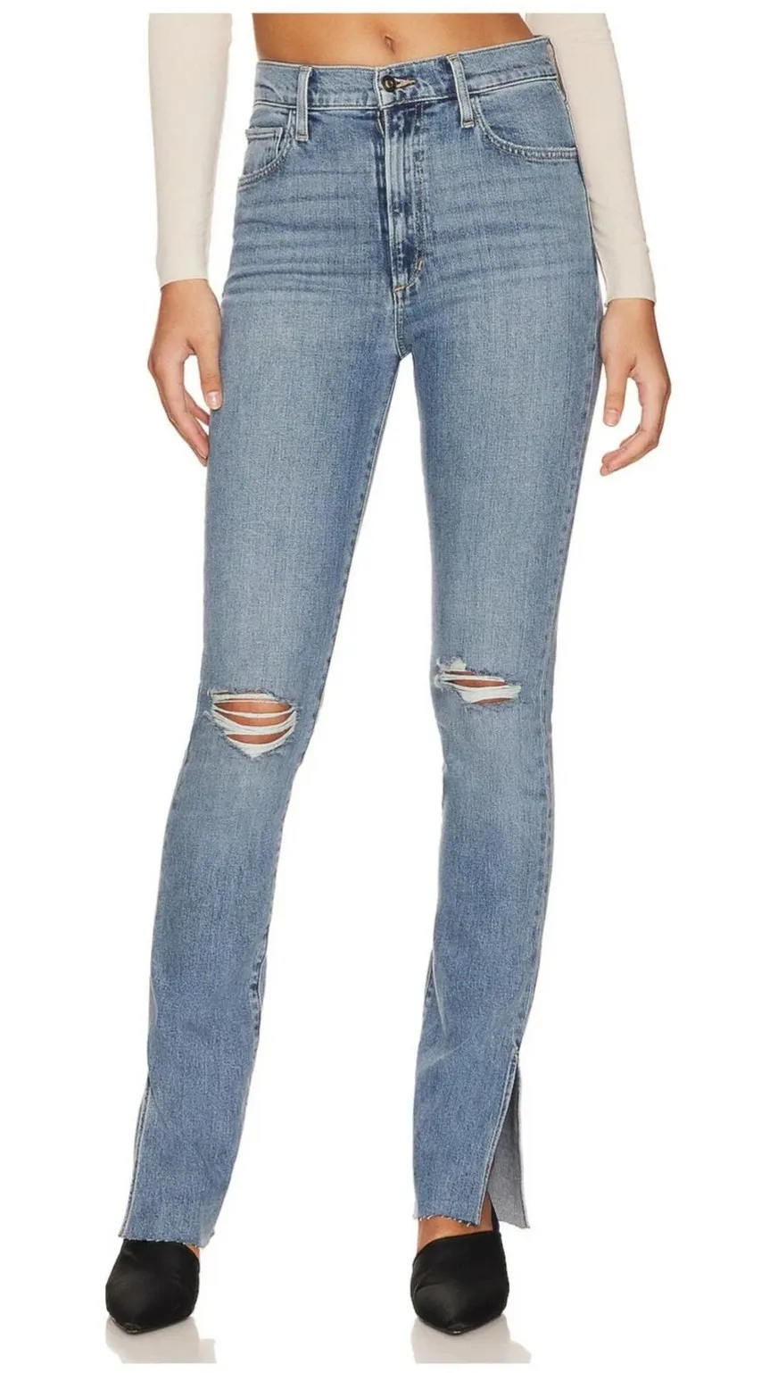 98% cotton, 2% elastane. Machine wash. Zip fly and button closure. 5-pocket styling. Intentionally ripped. Slit cuffs. Size: 23 COLOR: Laurel Canyon Approximate measurements laying flat: Length 44.5" Inseam 34" Waist 12" Manufacturer Style No. FCJLLC5993. Condition: New without tags