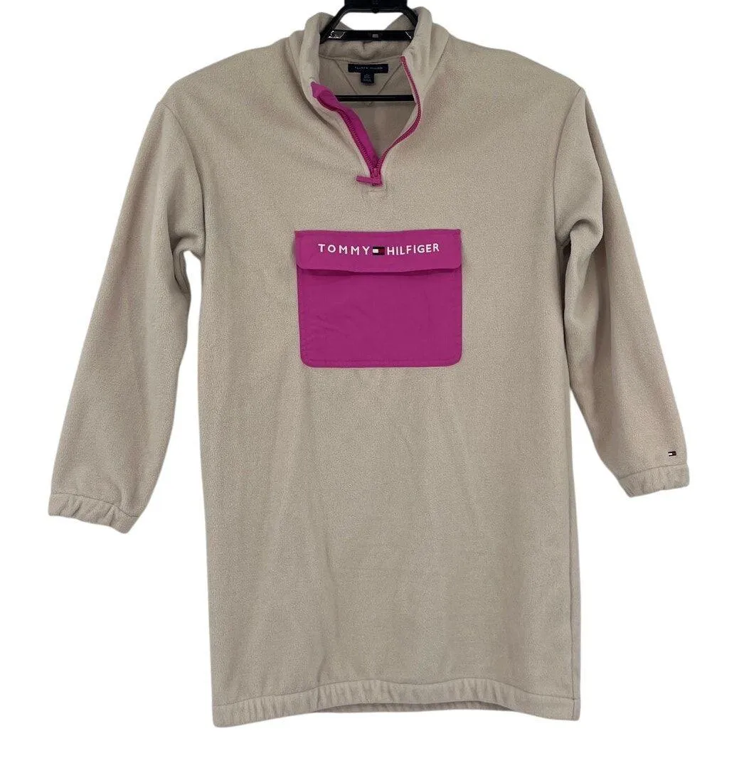 Tommy Hilfiger Women’s Beige Pink Fleece Quarter Zip Pullover Logo Pocket Beige/tan base with bright... Show more