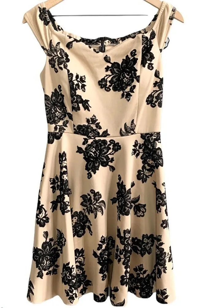 FE Forever Nude and Black Velvet Floral Dress NWT Brand new - purchased from a local boutique, tried on but never worn. Tan nude color fit and flare dress with black velvet floral design Off the shoulder style Slightly Flared skirt with tulle underneath Perfect homecoming or cocktail dress! Size Medium Top Rated Seller, Generally Same Day Shipping!