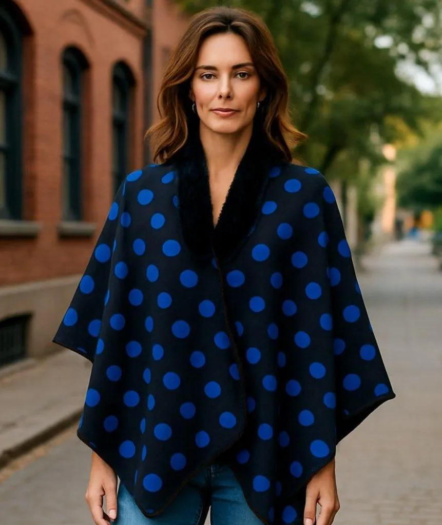 Polka dot pattern, faux fur detail, whipstitch trim Poncho sleeve, lapel collar Lightweight knit Acr... Show more
