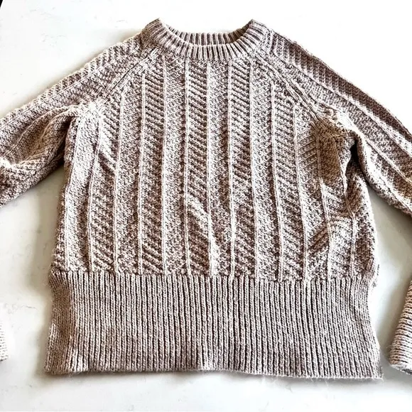 Very comfortable crewneck sweater with side slits. Slight tulip slit sleeve. Wool blend. Size XS