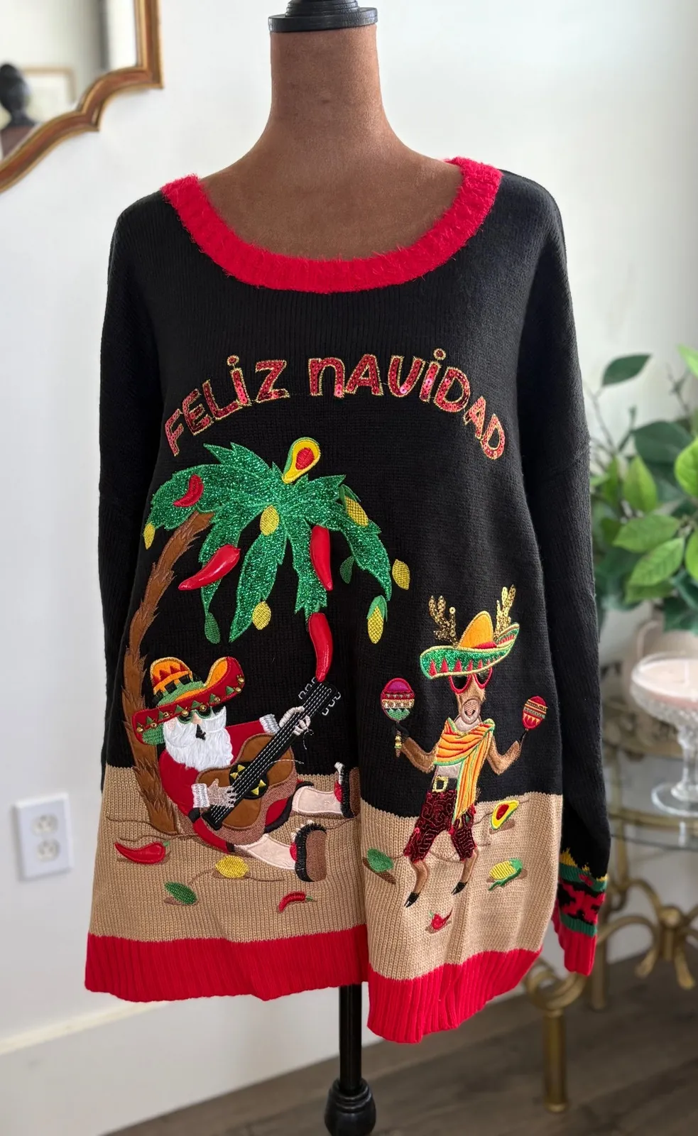 Deck the halls with laughter in this hilariously festive ugly Christmas sweater! A vibrant tapestry of holiday cheer unfolds with a whimsical scene featuring Santa in a sombrero, strumming a guitar beneath a palm tree adorned with chili peppers. The playful "Feliz Navidad" message sparkles above, while a dancing reindeer with maracas adds to the south-of-the-border celebration. This unique statement piece, trimmed with bright red, is sure to be a conversation starter at your next office party, family gathering, or ugly sweater contest. Style: Pullover Color: Black Department: Women Type: Sweater Material: Acrylic, Knit Sleeve Length: Long Sleeve Neckline: Round Neck Features: Embroidered, Sequin, 3D Details, Holiday Theme, Ugly Christmas Sweater Pattern: Solid Sleeve Type: Raglan Sleeve Fabric Type: Knit Accents: Embroidered, Sequin, Fringe Keywords: Ugly Christmas Sweater, Feliz Navidad, Santa Sombrero, Holiday Time Sweater, Plus Size Sweater, Christmas Party Outfit, Festive Sweater, Holiday Sweater, Novelty Sweater, Mexican Christmas, Santa Claus, Christmas, Reindeer, Sombrero, Chili Peppers