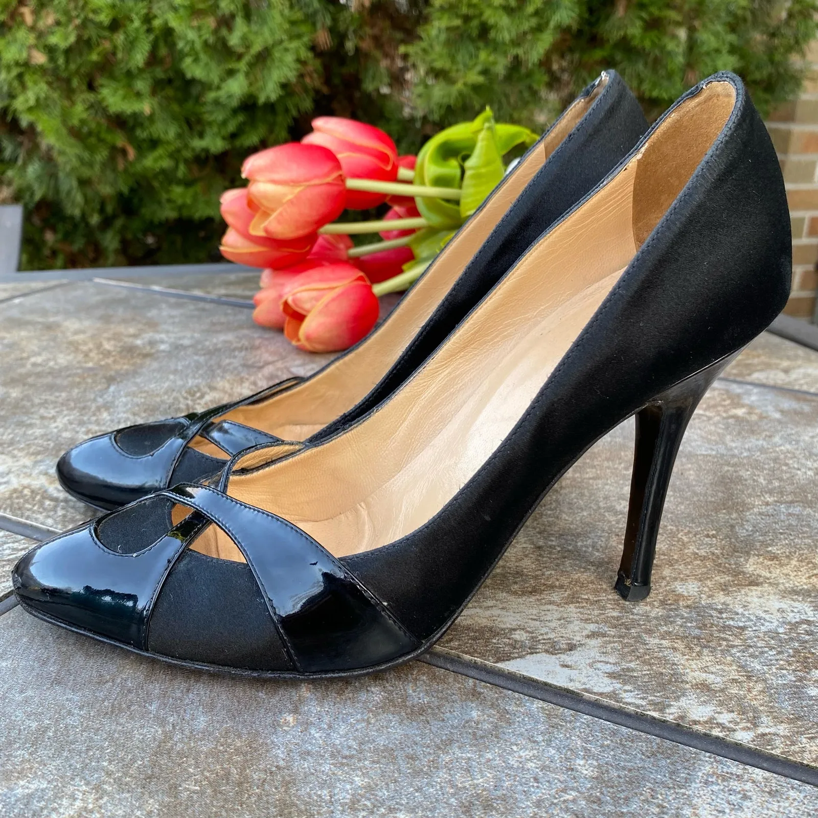Authentic Fendi Stiletto Pumps Satin & Patent Leather Made in Italy Size 38.5 4.25” Heel Light sc... Show more