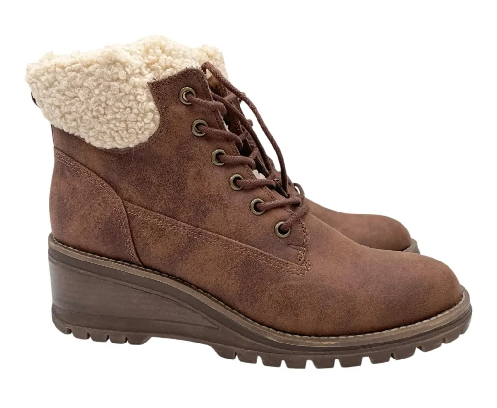 Fergie Genesis Wedge Heel Fur Trim Brown Faux Leather Ankle Boots Tan/brown with cream faux fur lin... Show more