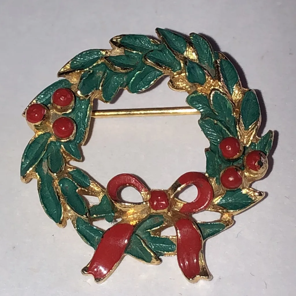 Charming brooch featuring a festive wreath design. Adorned with green leaves and a red bow. Perfect for holiday attire. Good condition with light discoloration on back Approximately 1.25” C1 Boho Vintage Street Style Minimalist Statement Piece Essential Trendy Fashion Forward Must-Have On-Trend Cute Casual Edgy Classic Rare Find retro mid century modern estate jewelry costume jewelry