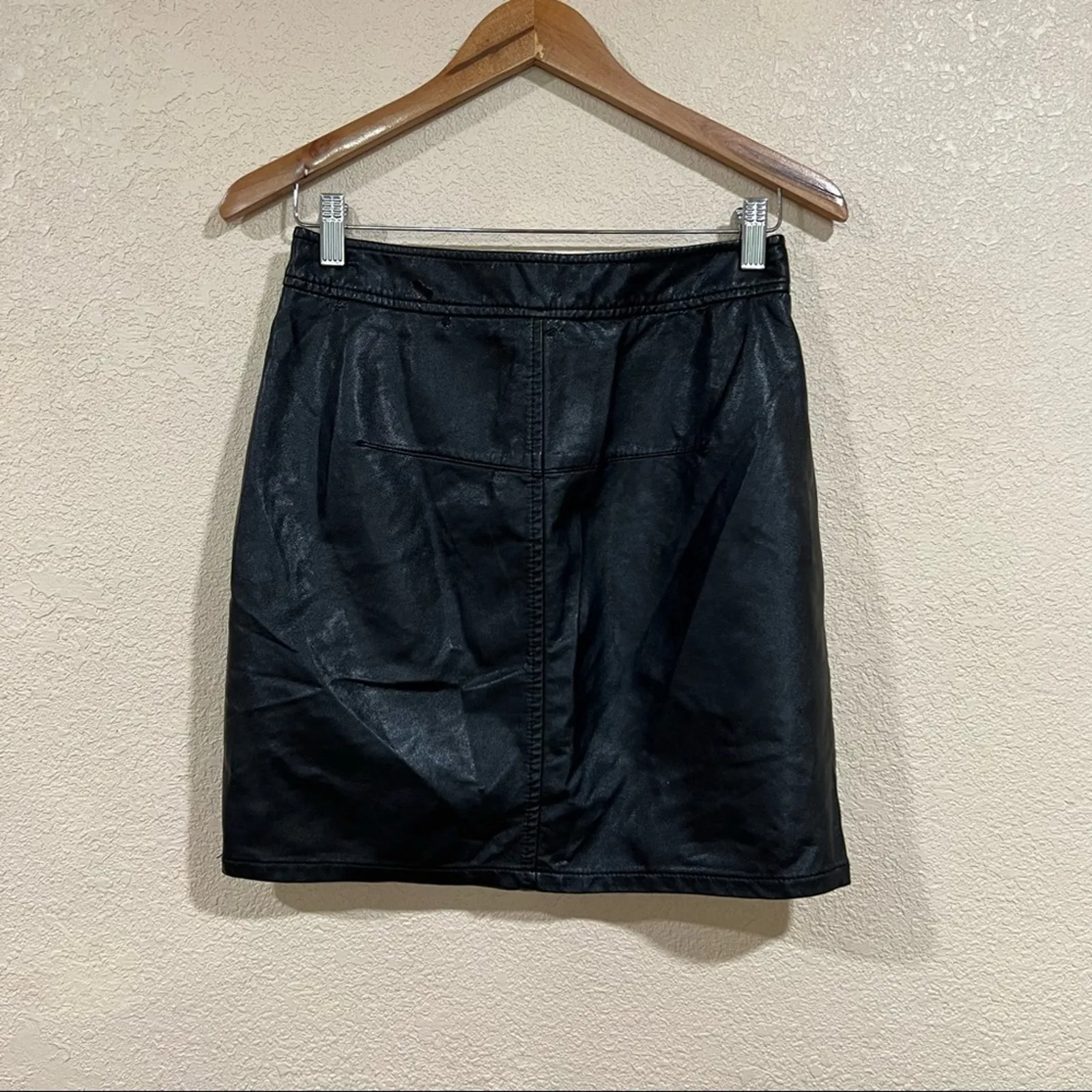 Sleek and sweet, this faux-leather Fifteen Twenty skirt features front pockets in a cool mid-thigh length. Black vegan leather 50% Polyurethane, 50% Viscose Hidden front fly with button closure. Pockets. Made in the USA. Flaws on back as shown