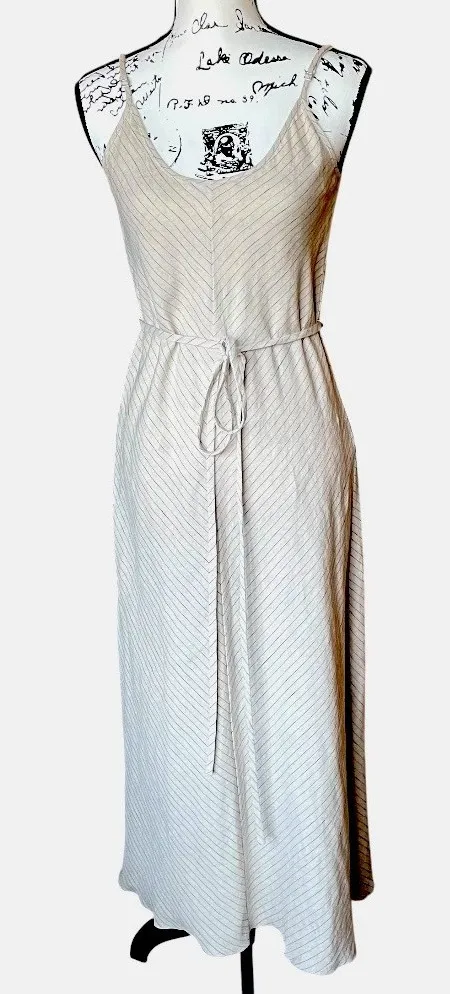 Effortlessly elegant, this Fifteen Twenty women's maxi dress features a chic neutral beige color with subtle black pinstripes, adjustable spaghetti straps, and a self-tie waist belt for a flattering fit. Lightweight and easy to wear, this piece is perfect for brunch, beach vacations, or summer events. Made in the USA with quality imported fabric. Versatile enough to dress up or down. • Color: Beige with thin black stripes • Sleeve Length: Sleeveless • Neckline: V-neck • Material: linen, made in USA of imported fabric • Care Instructions: Dry Clean Only • Features: Adjustable spaghetti straps, belted waist tie, unlined, pullover style • Condition: Pre-owned, excellent condition with no visible flaws • Measurements (approx.): • Pit to Pit: 16.5" • Length: 48" striped maxi, sleeveless belted, made in USA, summer, neutral tone, minimalist fashion, casual maxi, resort wear