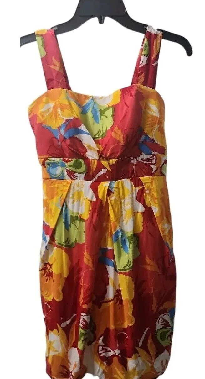 A vibrant floral print dress, perfect for adding a pop of color to your wardrobe. This sleeveless dress features a flattering silhouette with a fitted bodice and a gently flared skirt. The bright floral pattern, dominated by reds, yellows, and greens, creates a cheerful and eye-catching look. Ideal for a summer brunch, a garden party, or a casual day out, this dress combines comfort and style effortlessly. 14 inches pit to pit 13.5 inches hip to hip 29.5 inches in length Keywords: floral dress, summer dress, casual dress, sleeveless dress, floral print, red dress, medium dress, twenty one dress, party dress, vacation dress, womens dress, floral sundress, summer outfit, garden party dress