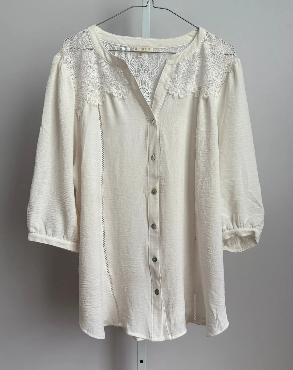 Fig + Flower Women's 2X Button Down Shirt with Crochet boho Blouse Brand new with tags. Chic and feminine top featuring a button-down front and delicate crochet detailing. This blouse boasts a relaxed fit with three-quarter sleeves and side slits, providing both comfort and style. The intricate crochet lace adorns the front and back yoke, adding a touch of elegance to the soft, textured fabric. The front has button closure with unique color and design, complementing the overall design. This versatile top would be great for many occasions. Keywords: Fig + Flower, Women's Top, Blouse, Crochet, Lace, Button Down, Three Quarter Sleeve, 2X, Plus Size, Bohemian, Boho Chic, Casual, Elegant Measurements: Pit to pit: 25" Length: 28" Weight: 11 oz SKU: SS16