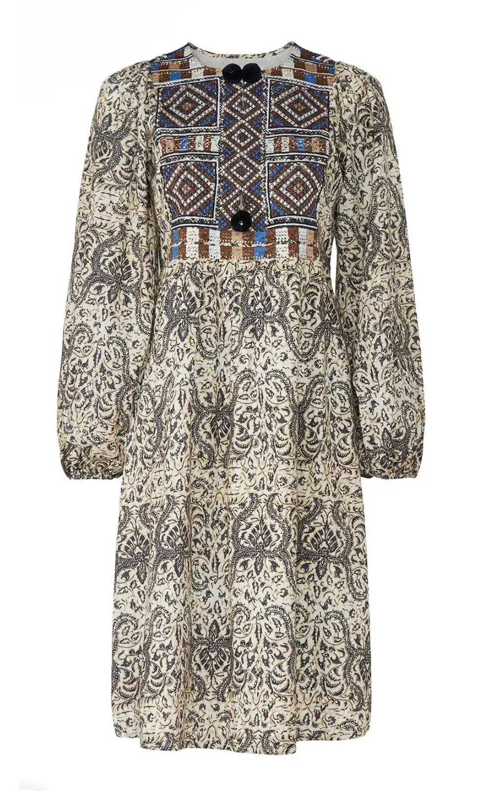 Excellent like new condition - no flaws or stains / no signs of wear Retails for $548 Batik-printed with embroidered details for a bohemian look, this sophisticated Figue dress is warm weather- ready in breezy cotton. Features: Green and cream embroidered cotton 100% Cotton / Dry clean only Shift styling Hidden side zipper Long sleeves. Crew neckline. Center front hook-and-eye closure. Partially lined. 42" from shoulder to hemline. 36” bust / 18” armpit to armpit Imported
