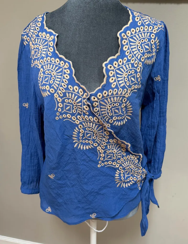 Figueroa & Flower Med Blouse Embroidered Faux Wrap Royal Blue Side Tie Crinkled - $19 - From Jasmyn