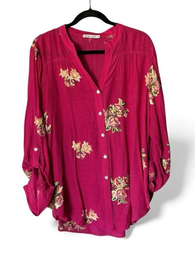Beautiful Figueroa & Flower women’s long sleeve top featuring vibrant pink and magenta floral embroidery. Lightweight and comfortable fabric with a button-down front, perfect for casual wear or dressing up. Details: • Brand: Figueroa & Flower • Size: XL • Color: Pink / Magenta • Style: Button down, long sleeve • Features: Floral embroidery, lightweight material • Condition: Excellent pre-owned condition 0835