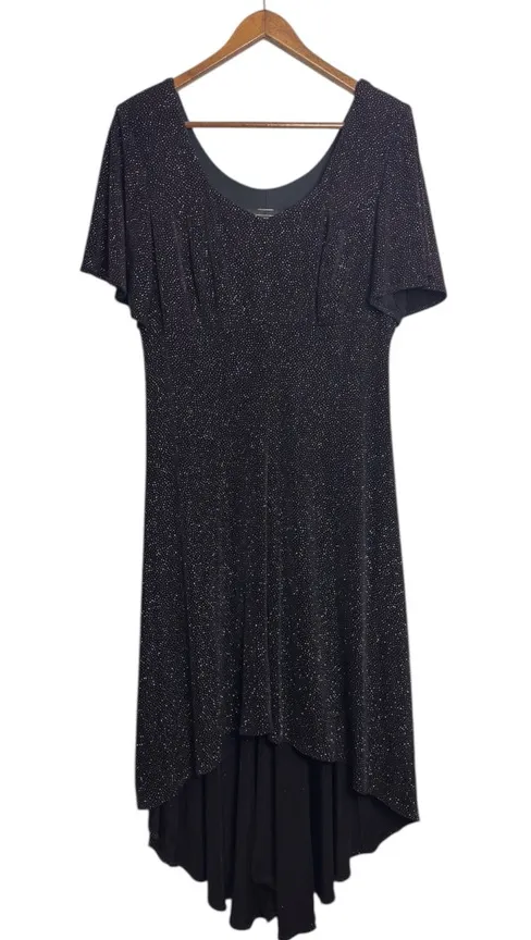 Shine in this elegant black glitter dress, perfect for any occasion. Its shimmering design adds a touch of glamour to your wardrobe. Dress tags - Church, summer, destination wedding, modest, event, graduation, travel, holiday, feminine, Christmas, grandma, bohemian, granola, resortwear, party, birthday, date night, boho, cottagecore, floral, tropical vacation, resort, flowy, casual, office, professional, Valentine's day, etc. BRAND: Filigree Limited SIZE: 8 CONDITION: Excellent condition EUC FABRIC CONTENT: 94% Acetate, 6% Lycra Spandex. Lining - Polyester *All items come from a smoke-free and pet-free home.