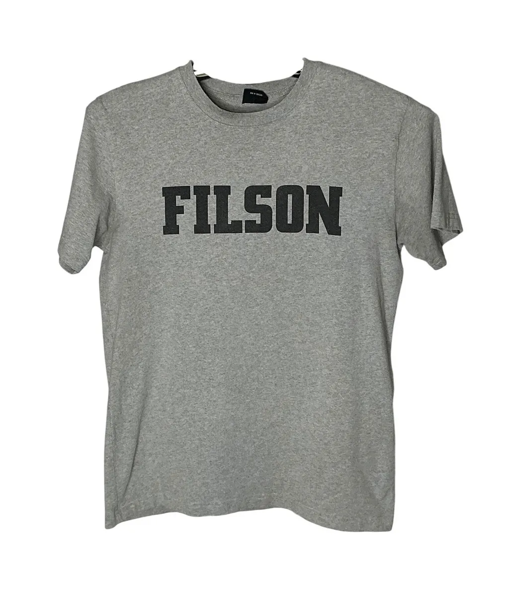 Classic Filson logo tee in soft heather gray cotton blend. Made in the USA with Filson's signature quality and minimal logo design. Listed as women's due to slimmer fit — please refer to measurements for best fit. This timeless piece offers Filson's rugged simplicity in a comfortable, versatile everyday style. Details: • Size: Women's Small (see measurements) • Measurements: Bust 16.25", Length 30", Sleeve 10.25" • Fabric: 90% Cotton / 10% Polyester • Color: Heather Gray with Black Logo Print • Made in USA • Condition: Excellent preowned condition — no holes or stains Suggested Retail: $55 Estimated Weight (for USPS Ground Advantage): 10–12 oz #MadeInUSA #HeritageStyle #Filson