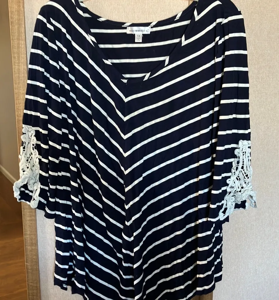 This relaxed blouse by roommates features a striking stripe pattern with a feminine touch of lace t... Show more