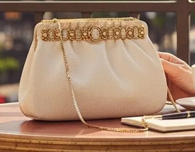 Condition: Good vintage condition; chain has a single kink; light wear on frame; some spotting (see photos) Key Features: Gold-tone metal frame Jewel twist-lock closure Snakeskin-textured exterior Chain strap Satin interior with logo plate Measurements: 8" L x 6" H x 2.5" D (open) Fabric: Faux snakeskin vinyl with satin lining