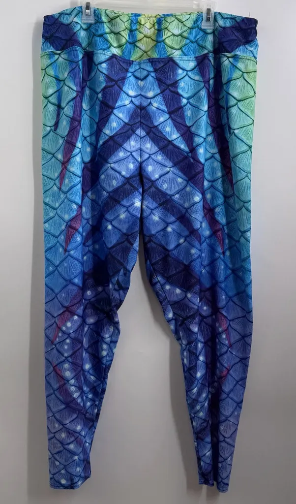 Mermaid Scales good preowned condition no noted flaws Women's plus size 6XL approximate hand measurements waist: 19" flat across rise: 17" inseam: 29" watery soft, all way stretch pattern is outfitted for comfort and support. Designed to be high or low waisted, for everyday wear or quick-dry dive wear. Guaranteed to never lose their stretch. Four-way stretch, which means fabric stretches and recovers on the cross and lengthwise grains. Made with a smooth, comfortable microfiber yarn Raised waistband Precision-cut and hand-sewn after printing Type: High-waisted leggings / Costume & performance leggings Fit: Full-length, slim leg with stretch Rise: High waisted Pattern: Mermaid scale / fantasy fish scale print Colorway: Blue, teal, aqua, green with purple accents Make a statement in these Finfolk Productions Navi Nightfall High Waisted Leggings, a bold fantasy-inspired piece designed for movement and visual impact. Featuring an allover mermaid scale print in rich blues, teals, and greens with subtle purple accents, these leggings channel an underwater, siren-inspired aesthetic. Designed with a high-waisted fit and comfortable stretch, they’re ideal for plus-size cosplay, mermaid looks, festival outfits, rave wear, dance, costume events, or performance use Perfect for cosplay, festivals, and themed events Finfolk Productions leggings, Navi Nightfall leggings, mermaid scale leggings, plus size cosplay