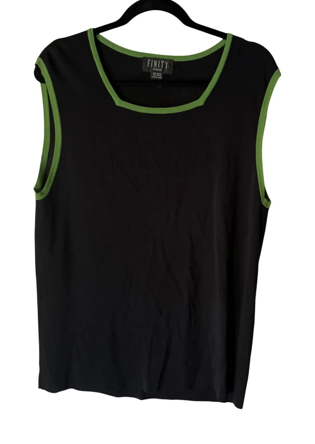 FINITY WOMAN Vintage 90s Grunge Black Sleeveless Square Neck Tank Top Top 1X Measurements: • Bust: 18 in • Length: 25 in Type: Tank Department: Women Style: Basic Material: Rayon, Nylon Neckline: Square Neck Sleeve Length: Sleeveless Sleeve Type: Casual Sleeve Pattern: Solid Accents: Contrast Trim Features: Stretch Fit: Regular Keywords: finity woman, sleeveless, square neck, tank top, plus size, lime green trim, casual, travel, layering piece, bold accent, summer, weekend wear