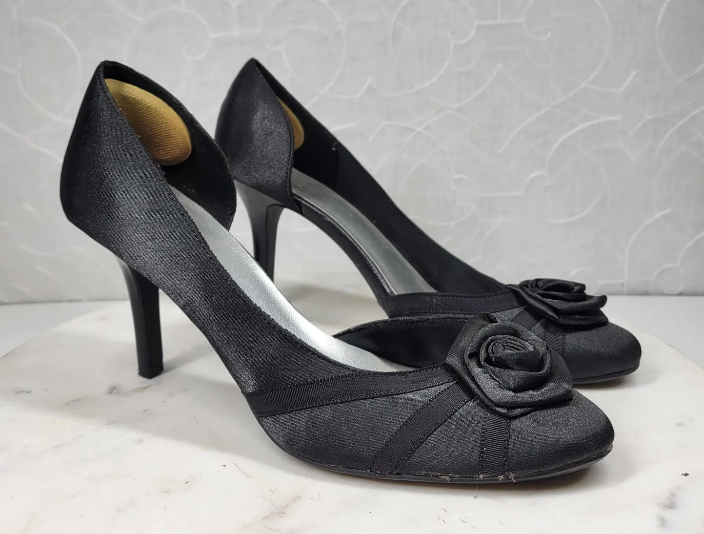 Fioni Womens Black Satin Floral Rose Almond Toe Stiletto High Heels Slip On Dress Pumps Shoes Size 8.5 Measurement: 3.5" Condition: Excellent Pre-Owned Brand: Fioni Size: 8.5 Color: Black Material: Leather Thanks for shopping with me today!! I ship on orders received by 3pm each day USPS is open. Most items are lovingly used so may show appropriate signs of wear but are clean and stored in a smoke free environment. I do my best to make note of any irregularities with an * and most are fixable as I don't want to sell you garbage but please feel free to inquire:)