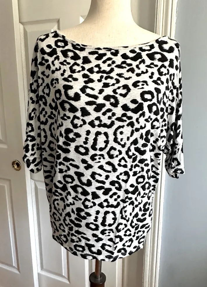 This bold and comfortable First Love top is perfect for casual office days, weekend brunch, or a polished work-from-home look. Made from a soft, stretchy jersey-style blend, it features a flattering boatneck, relaxed dolman sleeves, and a classic black and white pattern and offers a drapey, oversized silhouette. This animal print favorite is easy to style with leggings or tucked into high-waisted trousers for a sleek finish. Brand: First Love Style: Boatneck Dolman Sleeve Top Size: Medium (M) Fabric: 63% Polyester, 34% Rayon, 3% Spandex Color: Black and White Animal Print Condition: Good — Note: Some light wash wear present as shown in photos. From a smoke-free, dog-friendly home Measurements (lay flat, unstretched): Pit to pit (chest): 22” Shoulder to hem (length): 25” Sleeve length (from shoulder): 16” #FirstLove #AnimalPrint #DolmanSleeve #Boatneck #BlackAndWhite #CasualWorkwear #TunicTop #StretchyTop #WorkToWeekend #SizeMedium Light wash wear