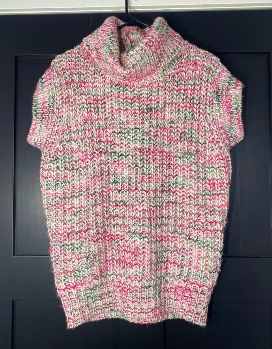 Like new! A cozy multicolor knit sleeveless vest sweater with a classic turtleneck. This piece showcases a chunky knit texture in a delightful blend of pink, white, green, and black hues. Its sleeveless design and generous turtleneck make it a versatile layering option. Perfect for a casual outing, a relaxed weekend brunch, or adding a touch of warmth to your everyday style. Style: Vest Department: Women Material: Acrylic Neckline: Cowl Neck Theme: Colorful Sleeve Length: Short Sleeve Type: Sweater Features: Oversized, All Seasons Pattern: Geometric Sleeve Type: Cap Sleeve Fabric Type: Knit Knit Style: Chunky-Knit Season: Fall, Winter Fit: Relaxed Occasion: Casual - I ship in 1-2 days. - The more you bundle, the more free items you get! - Shop my closet for: jeans, workout, athletic, shoes, career, resort, vacation, swim, fall, work, lounge - Items are Wash-2-Wear (some Unwashed)!