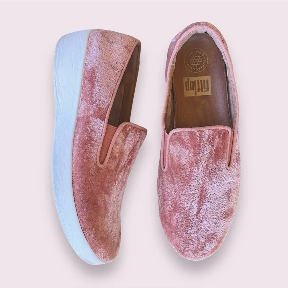 FitFlop velour pink lightweight slip ons, hollow bed leather insole, size 6.5 ••••tag Size 7US but it runs half size smaller•••• Foam platform sole (white) Fabric Lining Very comfy and light Preloved and in good wearable condition, clean and steam sanitized. Signs of overall wear but still a lot of life left. •Imperfections: scratch at side on the right shoe, signs on the exterior edges of soles, signs of wear on the outer sole. Please see photos for details Washed and sanitized, no odor Smoke/Pet free home, ships ASAP! Bin 5