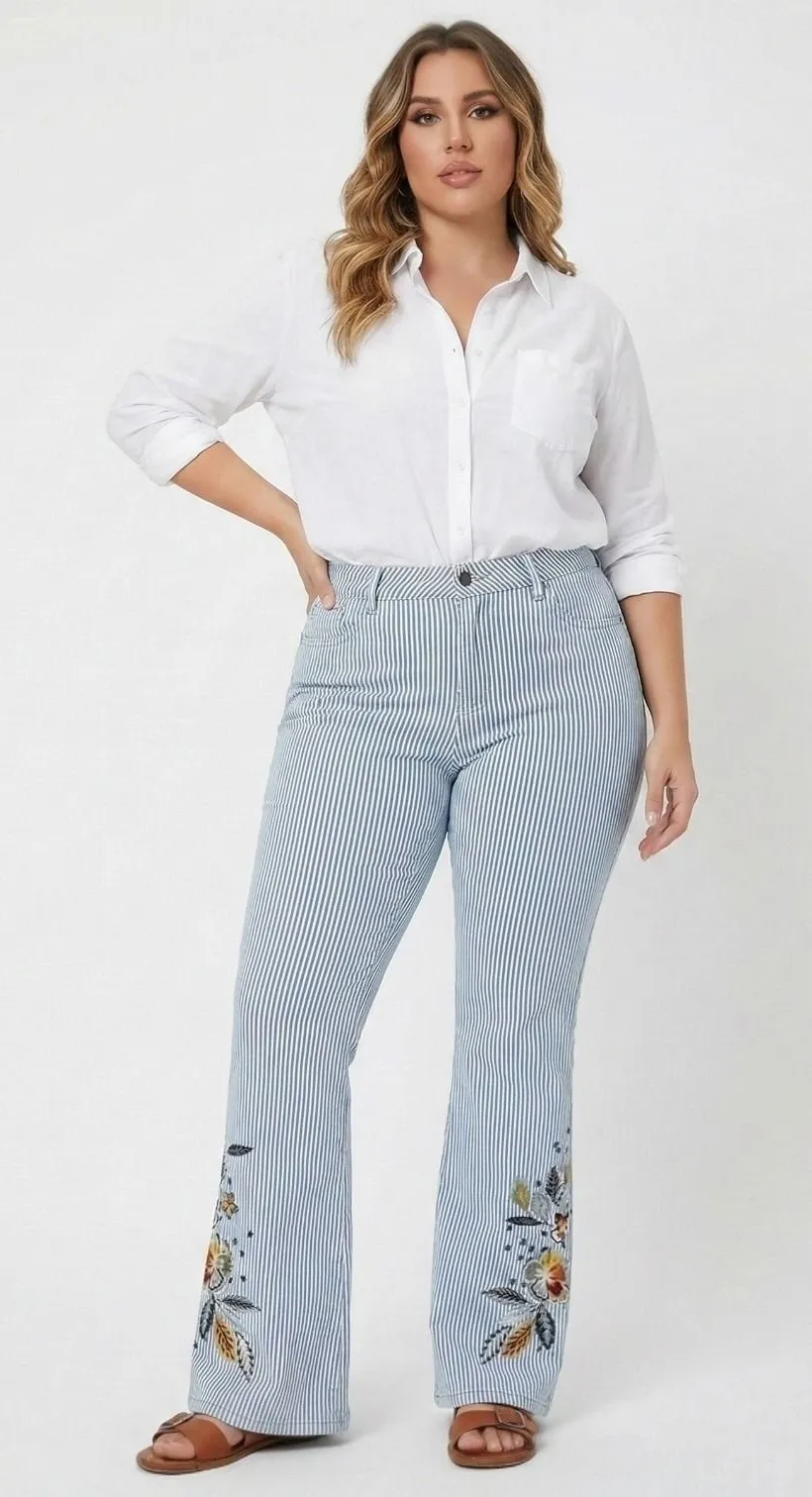 Striped embroidered flare jeans in light blue with floral accents. These jeans offer a comfortable stretch and a flattering flare silhouette, perfect for adding a touch of unique style to your everyday wardrobe. Ideal for casual outings, brunch with friends, or a relaxed day exploring. See included image of size chart for fit reference. Size: 16-18 (3X) Style: Flared Department: Women Fabric Wash: Light Type: Jeans Accents: Embroidered Features: Stretch, Pockets Fit: Classic Pattern: Striped Fabric Type: Denim Material: Cotton, Spandex Closure: Zip, Button Theme: Flower, Nature, Bohemian Keywords: Flamingals jeans, embroidered denim, striped pants, bell bottoms, stretch denim, plus size fashion, boho style, casual wear, floral embroidery, light wash, wide leg, statement jeans Each item is stored in a smoke and allergen free environment. Orders typically ship within 1–2 business days.