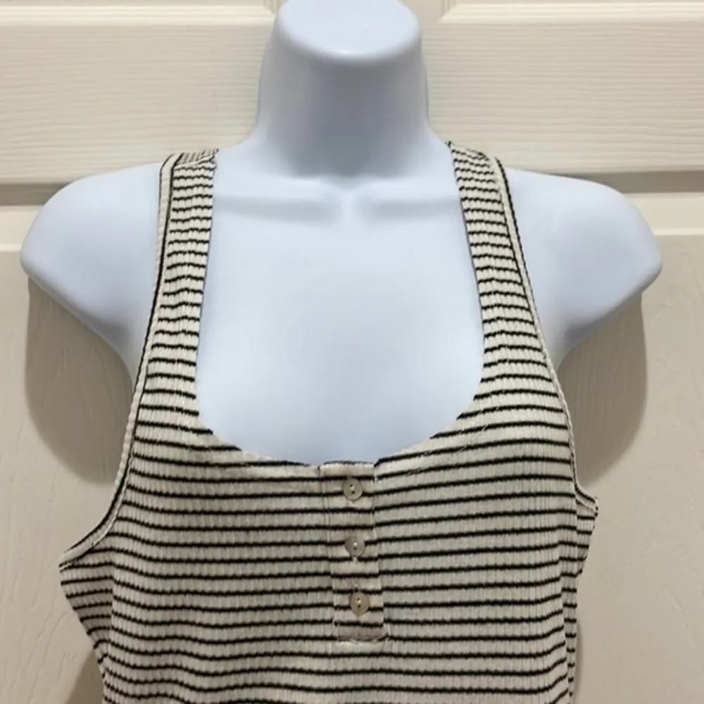 Flawless Black and White Ribbed Racer Back Midi Dress - Scoop neck with 3 lithe of pearl buttons - Fitted style dress - Raw hem finish Color: White with Black Stripes Size: Medium Pit to pit: 14.5” Length from neck to hem: 37.5”