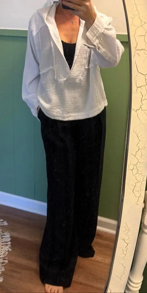 Soft white gauze hoodie top by Flawless, made from 100% breathable cotton with a lightweight crinkled texture. Features a relaxed silhouette, open V-neckline with a hood, dropped shoulders, and long sleeves with button cuffs. The fabric is airy, comfortable, and perfect for layering in warm weather. Looks great with wide-leg pants, shorts, or swimwear. In excellent condition
