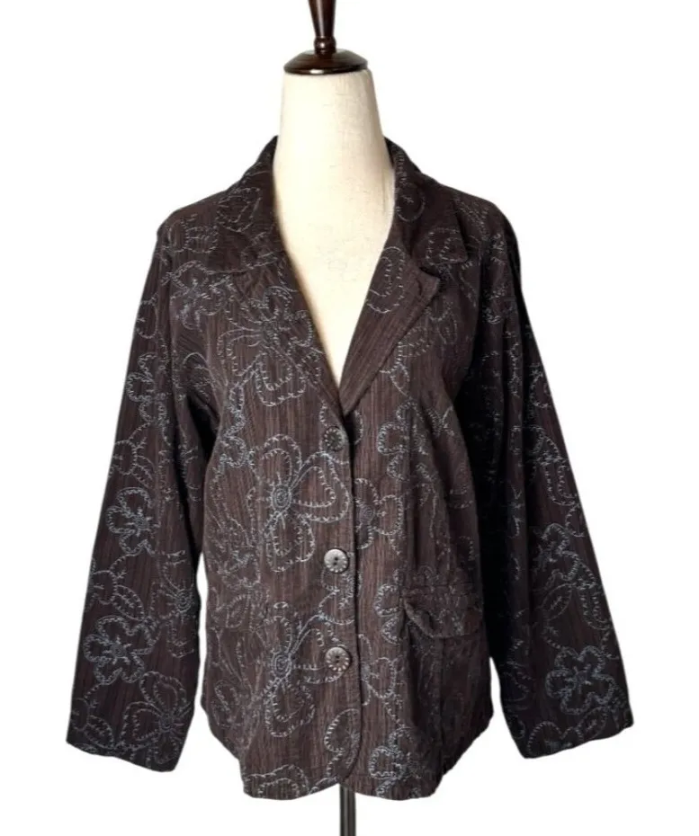 A tailored corduroy jacket featuring intricate floral embroidery. The button-up front and notched collar add a refined touch suitable for versatile wear. Features: • Single Breasted Cut • Notched Lapels • 3 Button Closure • Front Flap Pockets • Corduroy Style Fabric • spring, fall, winter, summer • floral • machine washable • Floral Embroidery • 100% Cotton Measurements: armpit to armpit 21 in / 53 cm length 23.5 in / 60 cm sleeve 21 in / 53 cm Great Pre-Owned Condition. (see pics for details) designer, luxury, preppy, classic, staple, embroidered, corduroy, floral, boho, bohemian, cottagecore, academia, career, corpcore, office, workwear, business casual, dinner, Professional, Business, Office, Workwear, Classy, Elegant, Classic, Modest, work, business attire, academia, dark academia, nerdy, minimalist, chic, stylish, trendy, college, school, knit, fall, winter, spring, summer, outdoor, outerwear, minimalist, sophisticated, elegant, mature, old money, country club, timeless, quiet luxury grandmacore, grannycore, coastal grandma, Size 4, Size 6