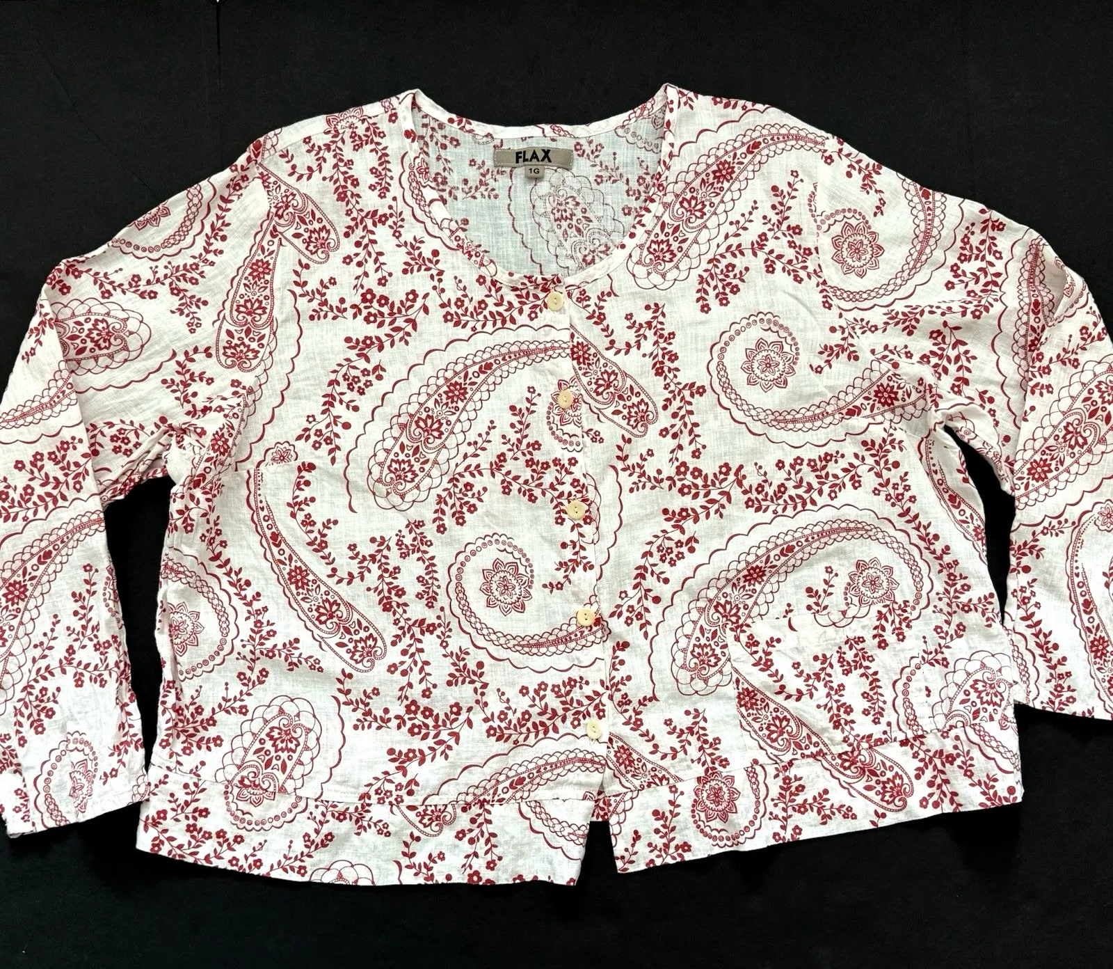FLAX Linen Lagenlook Top Jacket Women 1G 18 20 Button Up Red White Floral Paisley Print Condition -... Show more