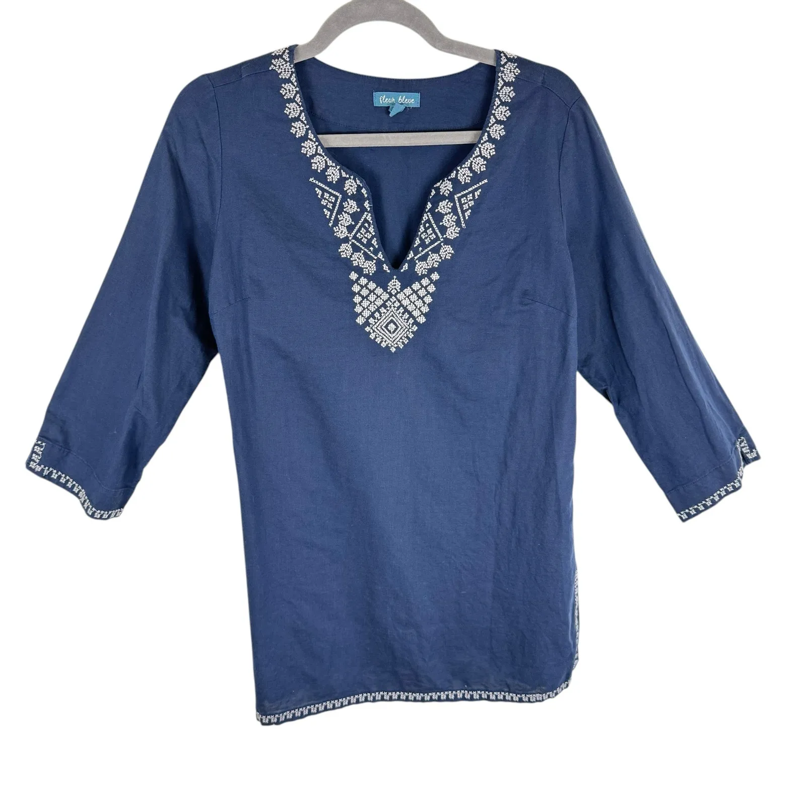 Excellent preowned condition. Navy blue 3/4 sleeve lightweight tunic top with white embroidery detai... Show more