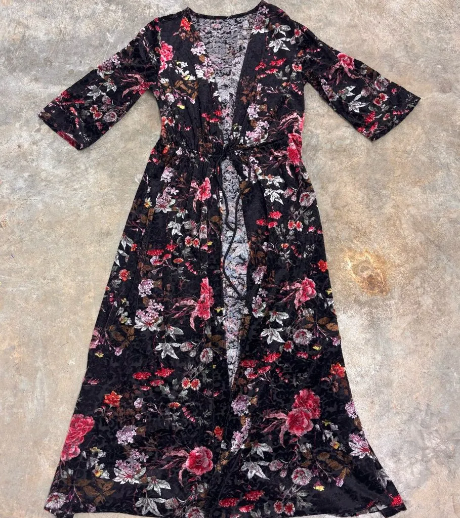 Embrace your inner Stevie Nicks with this stunning burnout velvet duster. This floor-length kimono features a romantic "Midnight Garden" floral pattern in rich reds, purples, and greens against a sheer black mesh and plush velvet base. The open-front design includes a delicate drawstring waist tie, allowing you to wear it cinched as a dress/robe or loose and flowy as a duster jacket Adjustable Waist (See measurements) OSFM Burnout Velvet, Floral Duster, Kimono Cardigan, Gothic Romantic, Festival Wear