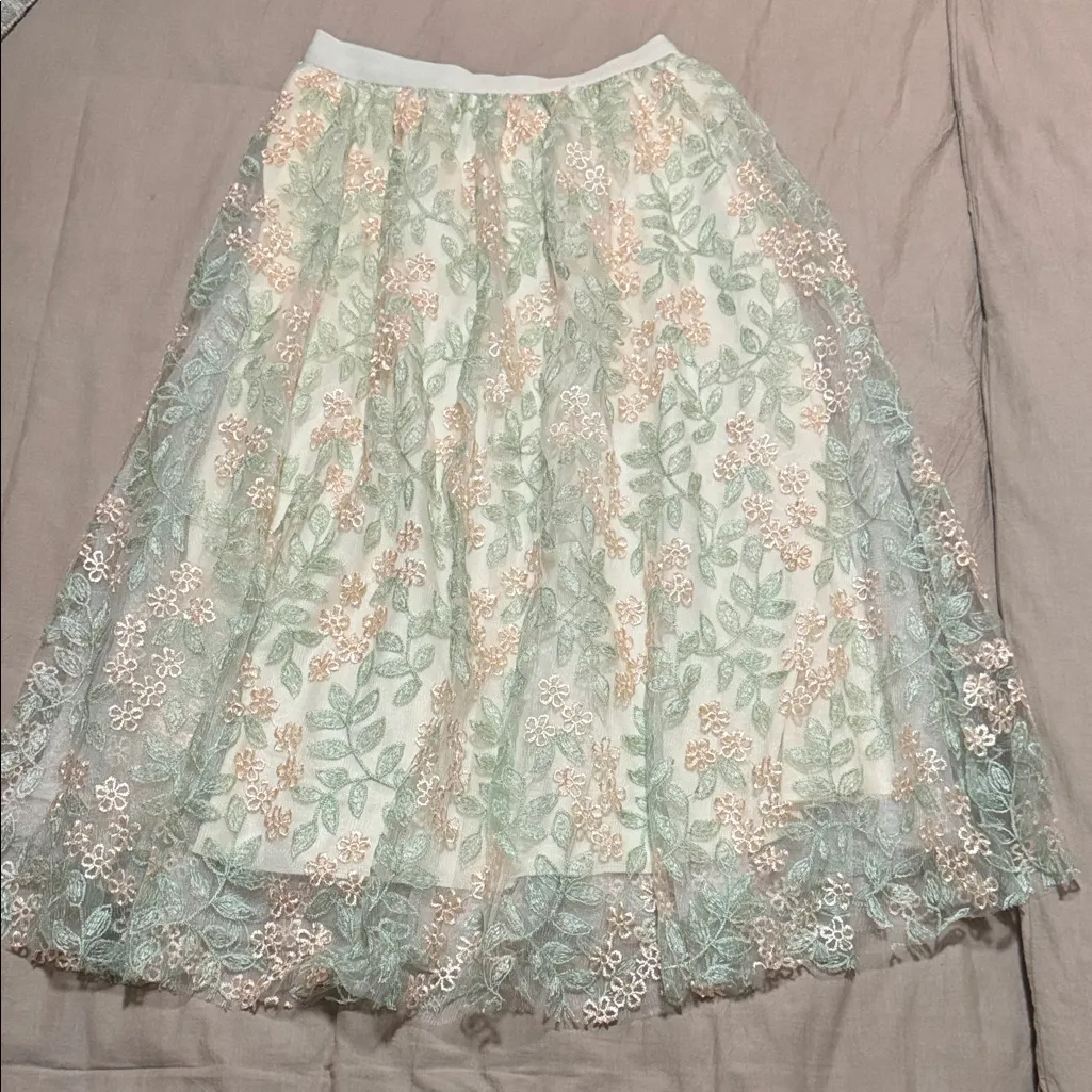 Floral Lace Tulle Midi Skirt in Cream and Green and Pink Size L - $15 New With Tags - From Janice