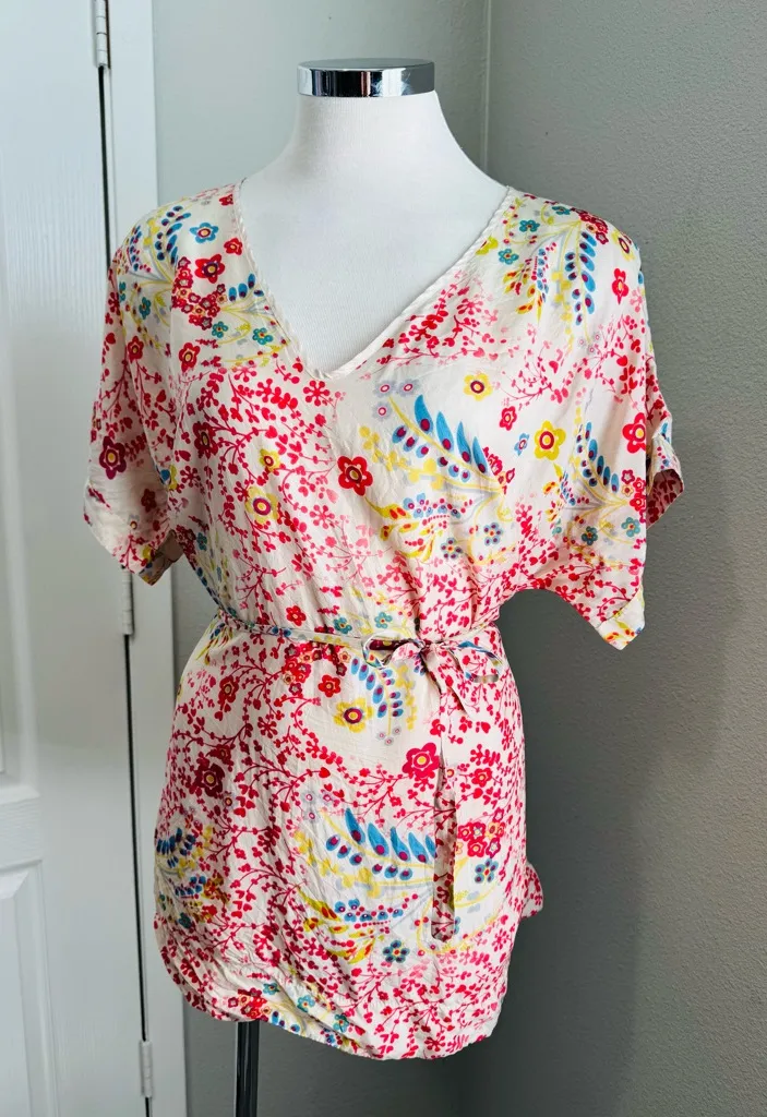 A charming floral tunic top, perfect for adding a touch of elegance to your wardrobe. This piece features a flattering V-neckline and short, kimono-style sleeves, offering a comfortable and stylish fit. Excellent pre-owned condition Size XS Measurements approx. Chest 22" Length 30" Keywords: floral tunic, floral top, kimono sleeve top, v-neck top, belted tunic, summer top, bohemian top, casual top, lightweight top, short sleeve top, floral print, tunic blouse Excellent pre-owned condition Size Medium Measurements in pictures approx Chest 17" Length 24"