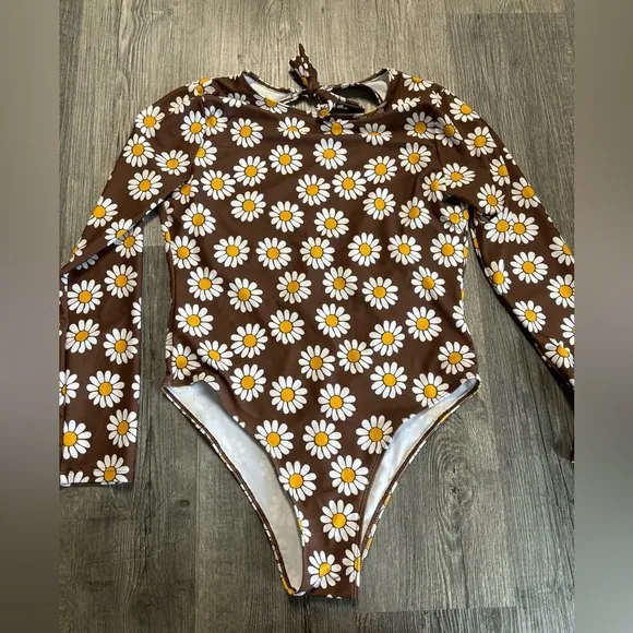 Floral Print Vintage Look Long Sleeve One Piece Bathing Suit Brown Size L - $19 - From Annika
