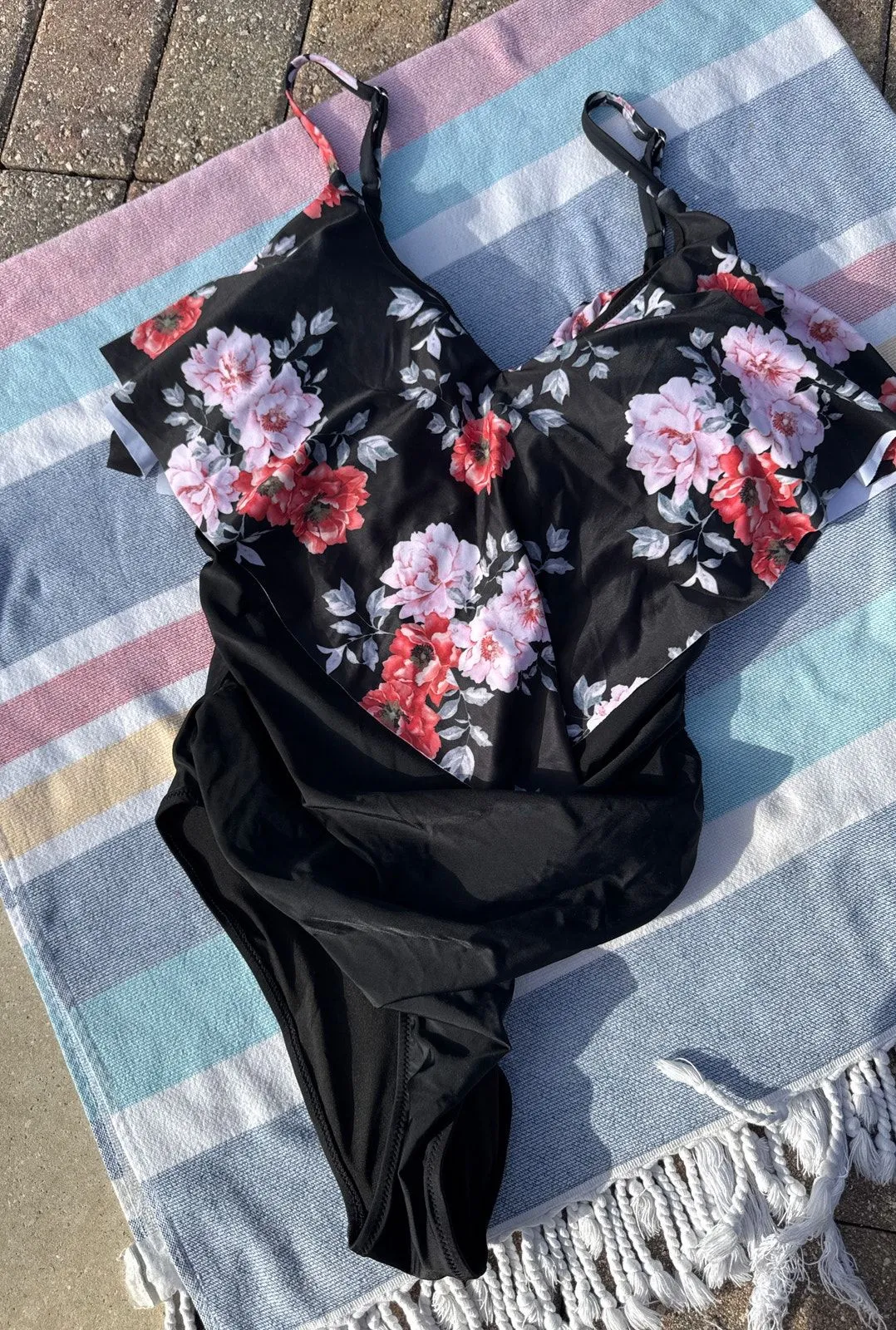 Turn heads poolside in this gorgeous Black Floral One-Piece Swimsuit featuring a romantic ruffled neckline, vibrant pink blooms, and comfy adjustable straps for your perfect fit! Size XL with moderate rear coverage and soft stretch lining for support. 🌸 Feminine floral + flirty ruffle = Vacay-ready 💃 Mix of timeless black + floral for versatile summer style ✨ New swimwear listed DAILY! Click ❤️ Save Seller for alerts + exclusive deals 💦 Shop now & dive into sunshine with FAST shipping!