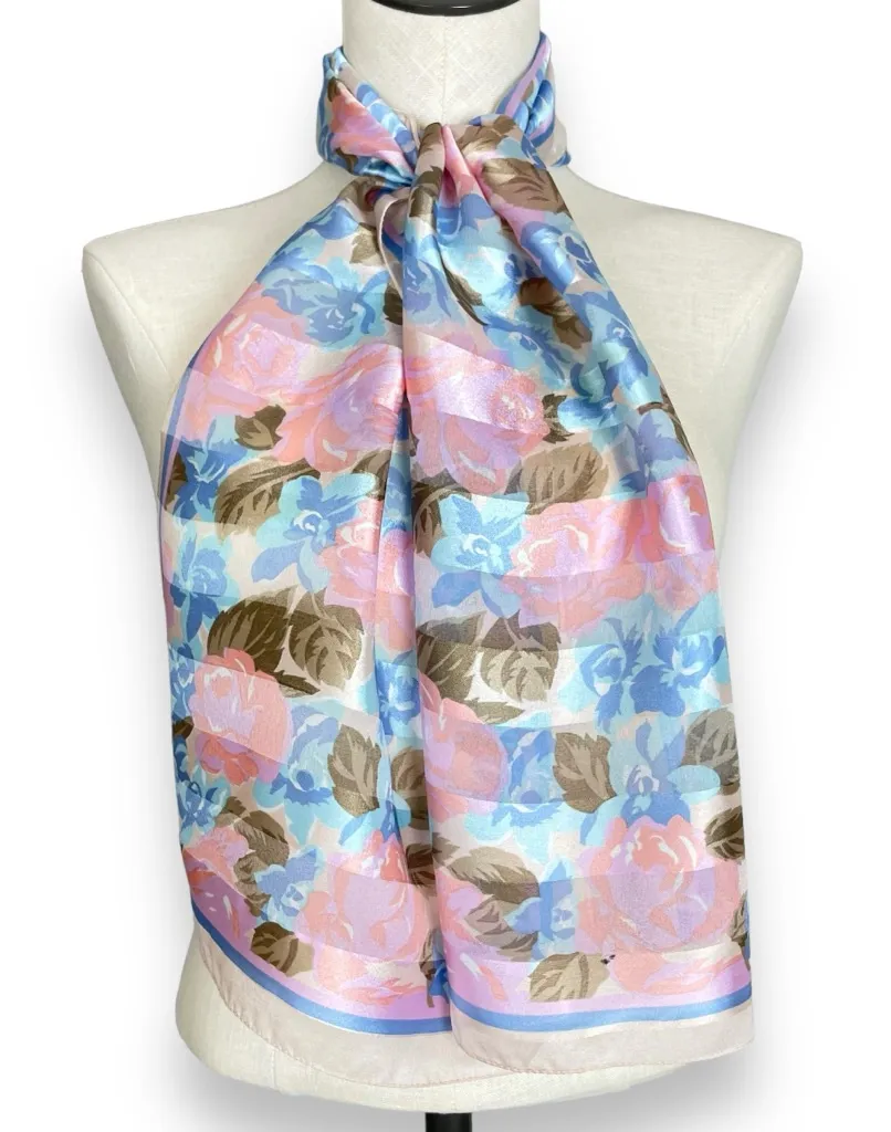 Vintage rectangular scarf with rose print all over and alternating sheer and more opaque with a sheen stripes. No brand or materials tag. Condition: Gently preloved vintage with minor thread pulls and a small dark dot. Approximately 11" x 53" Cleaned and from a smoke-free home. Fast shipper!