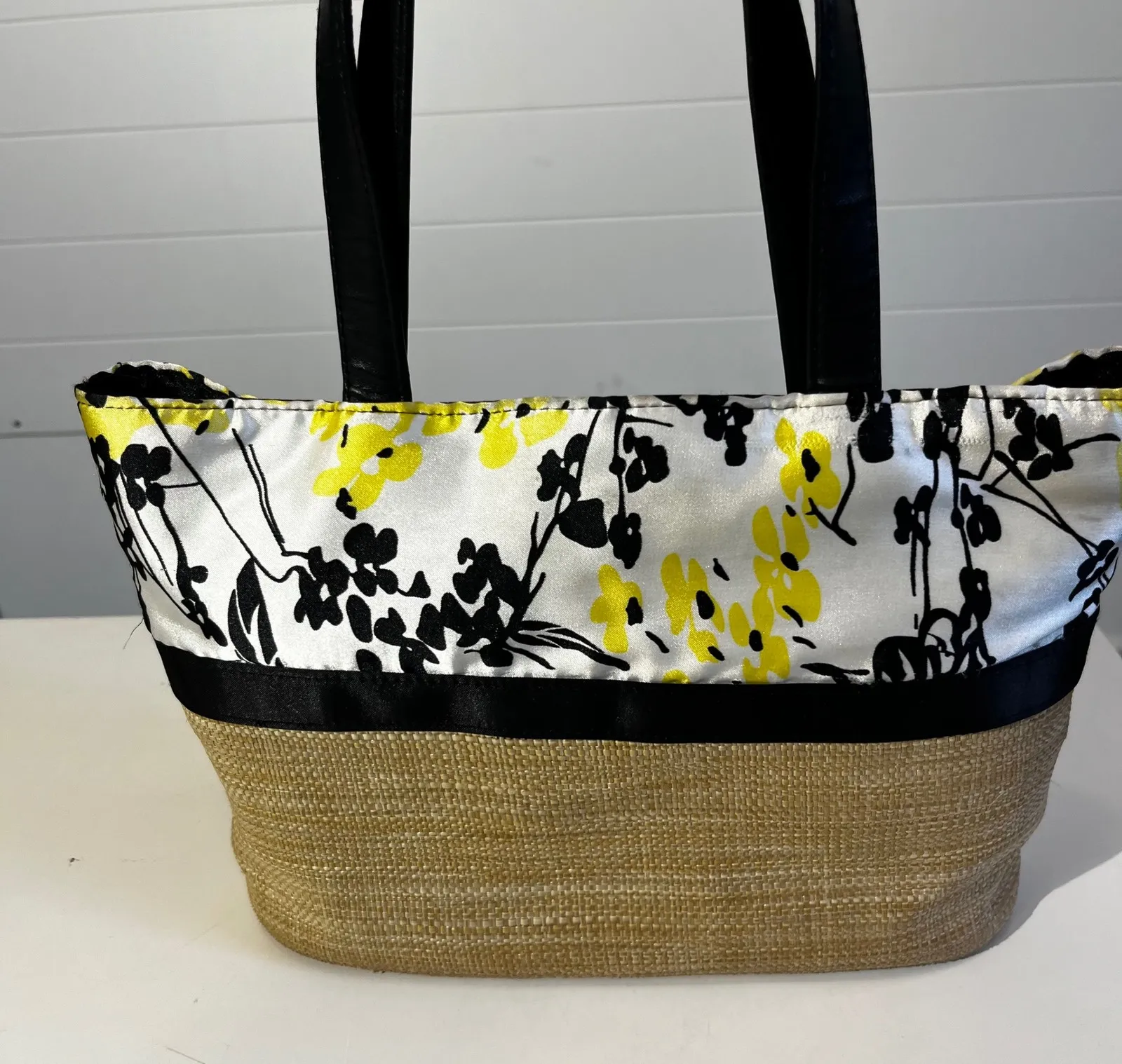 Escape the ordinary with this stunning tote bag. A harmonious blend of textures and patterns, this bag features a natural woven straw base, a sleek black band, and a vibrant floral print top. Inside, a secure snap closure offers peace of mind, making it perfect for carrying your daily essentials. Envision yourself strolling through a sun-drenched farmers market or enjoying a casual weekend brunch with this chic accessory. Measurements: • Width: 12 inches Exterior Material: Straw, Satin Style: Tote Exterior Color: Desert Beige Department: Women Lining Color: Black Handle/Strap Color: Black Handle/Strap Material: Leather Lining Material: Fabric, Satin, Polyester Hardware Color: Black, Silver, Yellow Pattern: Floral Print Closure: Snap Bag Width: 12 in Keywords: tote bag, straw bag, beach bag, floral tote, yellow tote, black and white bag, summer handbag, shopper bag, woven tote, floral print, casual tote, farmers market bag, weekend bag, womens bag Thanks for Looking!